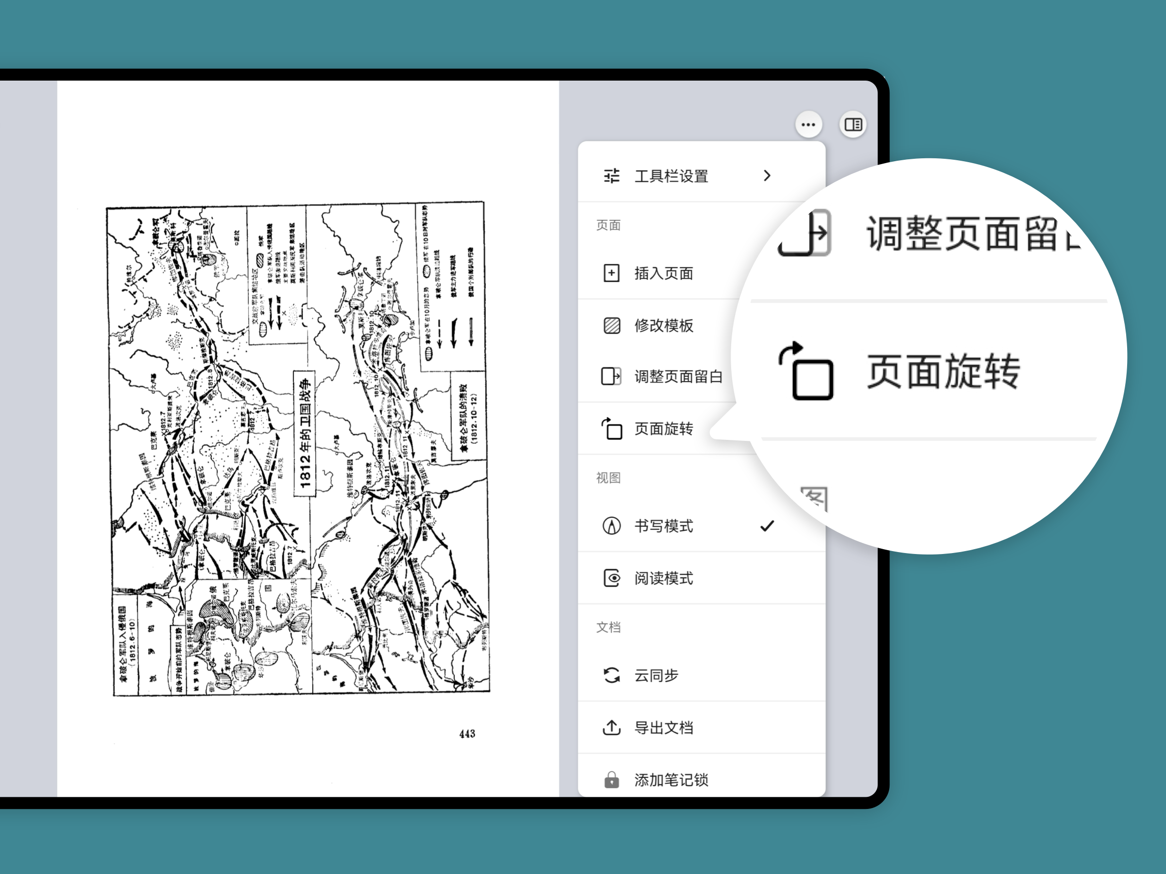 如果您的文档需要调整页面的显示方向,操作步骤为先滑动至需要旋转的笔记页面,然后在笔记编辑页右上角“更多菜单”内点击“页面旋转”功能,再选择需要旋转的方向和角度,我们支持顺时针旋转90°、逆时针旋转90°、旋转180°。