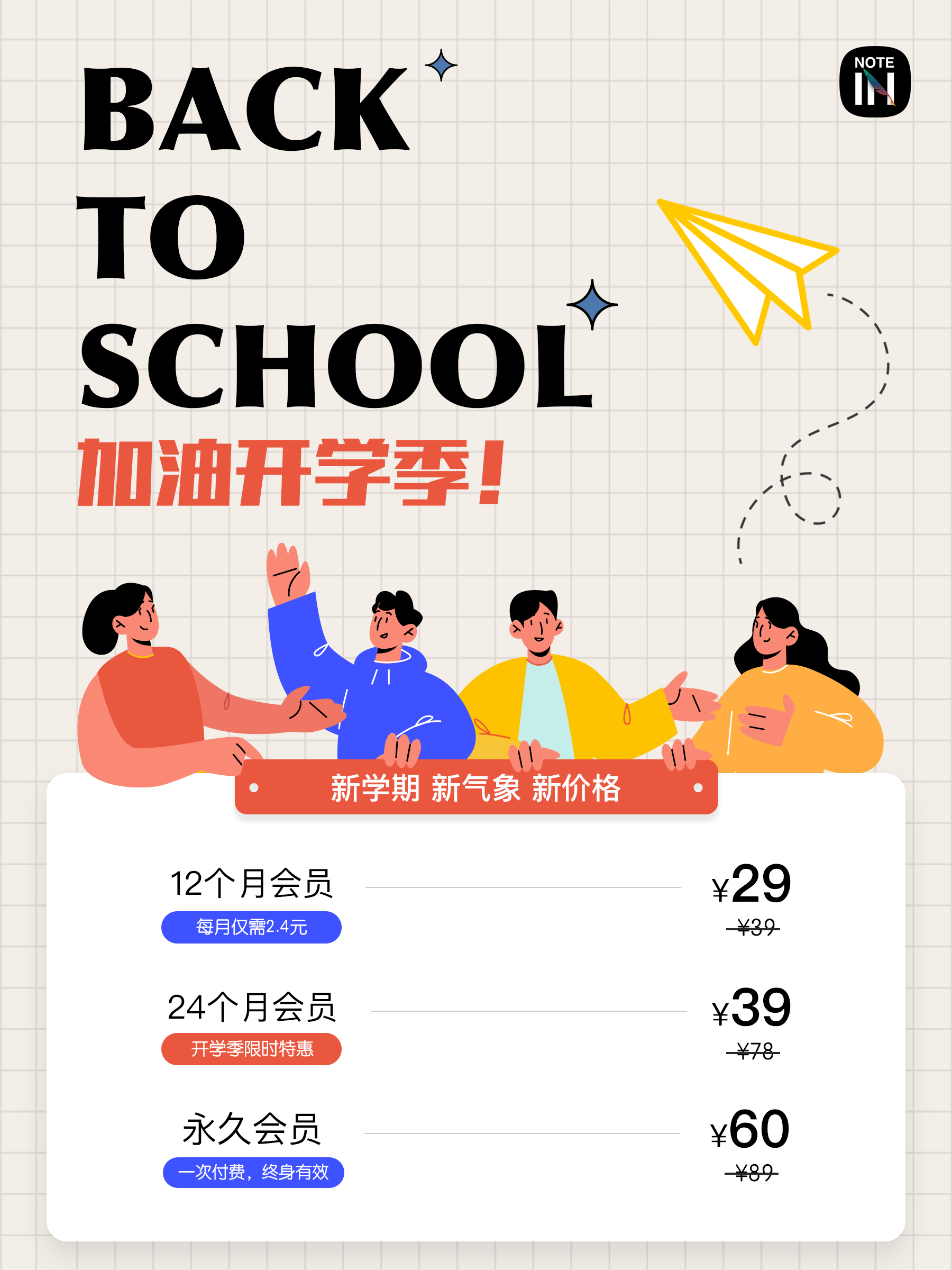 Notein在开学季期间正式推出12个月的年度会员(29元),并为大家带来了限时特惠,24个月会员只需39元,相当于两年5折的价格,千万不要错过。